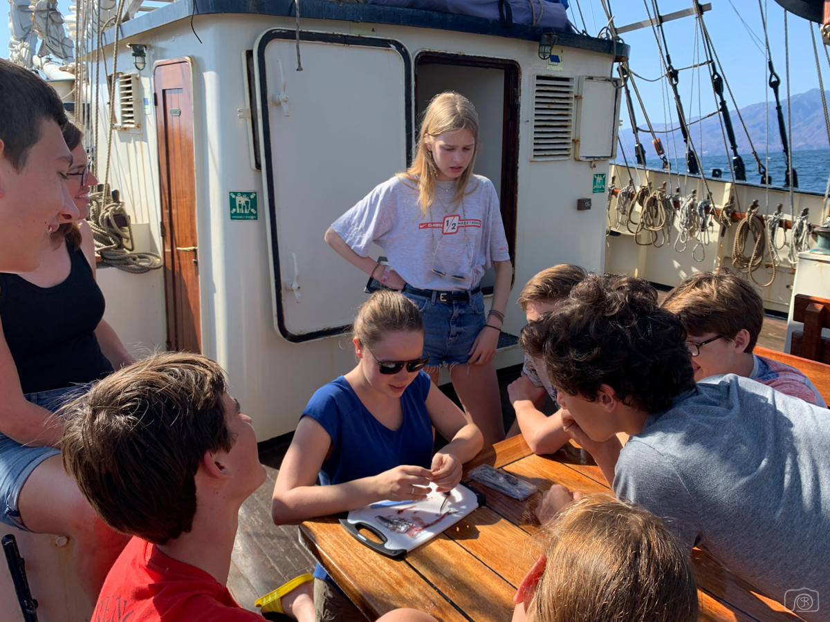 Een vast onderdeel van School at Sea is een snijpracticum, waarbij (vliegende) vissen worden ontleed om te kijken hoe zo’n beest er van binnen uitziet. En: welke verschillen zijn er van binnen en van buiten tussen vliegende vissen en normale vissen en waarom zijn die verschillende soorten zo geëvolueerd? Vaak zorgen de docenten er voor dat er ook genoeg normale vissen aan boord zijn, zodat iedereen naar hartenlust vissen kan ontleden. Alhoewel… Niet iedereen is daar even enthousiast over, zoals Elena uit ’19-’20 beschrijft: